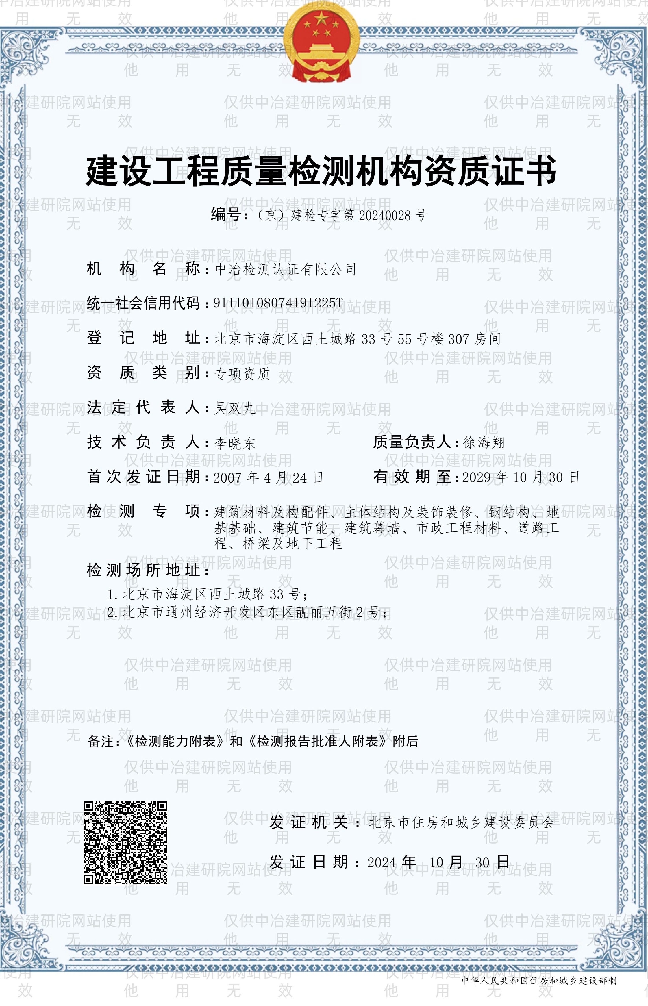 建設工程質量檢測機構資質證書